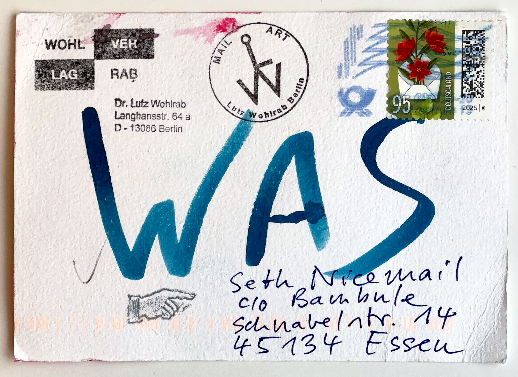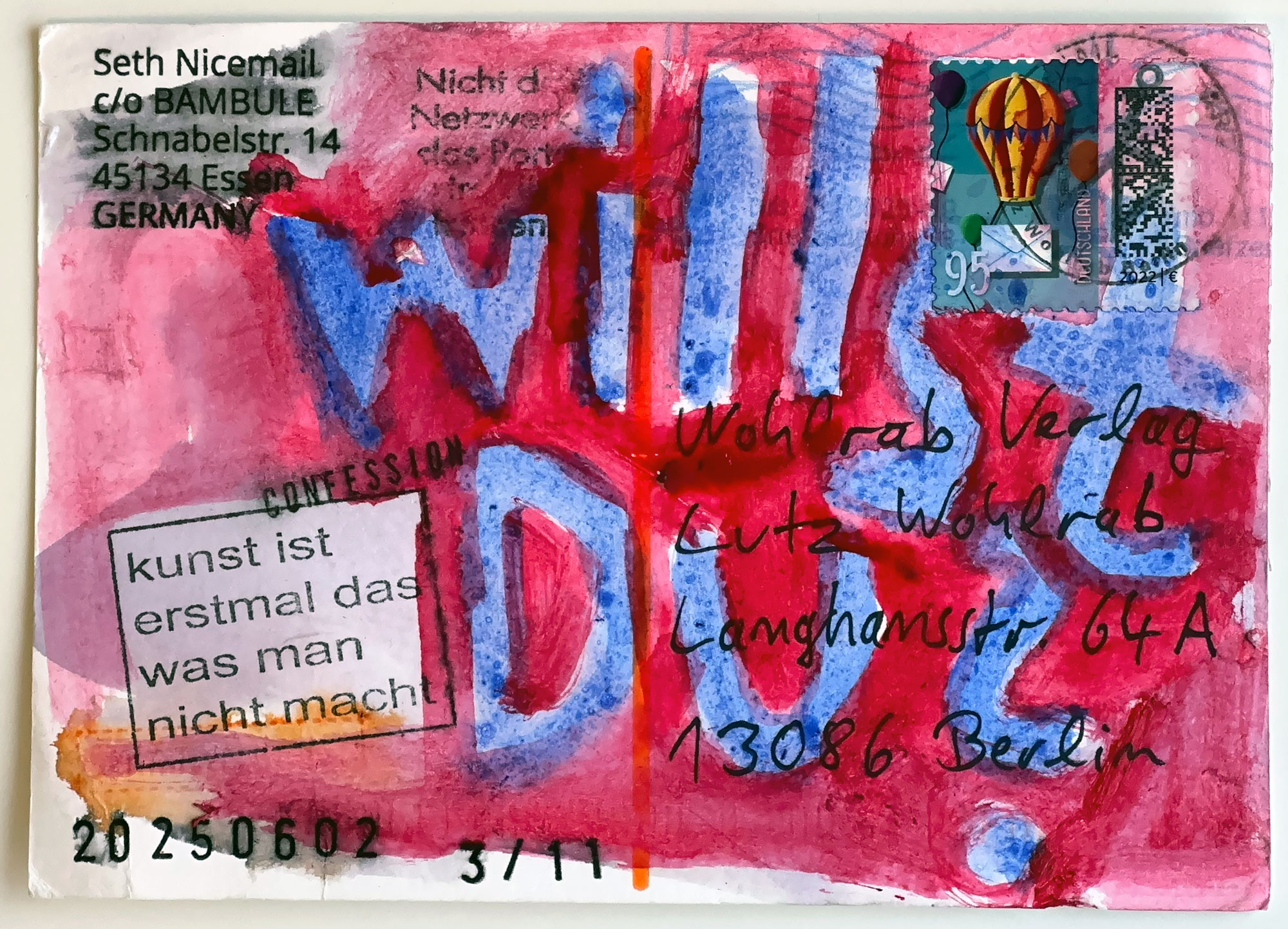 Lutz Wohlrab 20250820 Berlin-based Lutz Wohlrab has been a well-known (mail) artist, collector and publisher for about 40 years. He recycled my postcard from my Confession project in an exemplary way. Well, that’s us Germans. 😉 Submit a Comment Cancel replyYour email address will not be published. Required fields are marked *Comment * Name * Email * Website